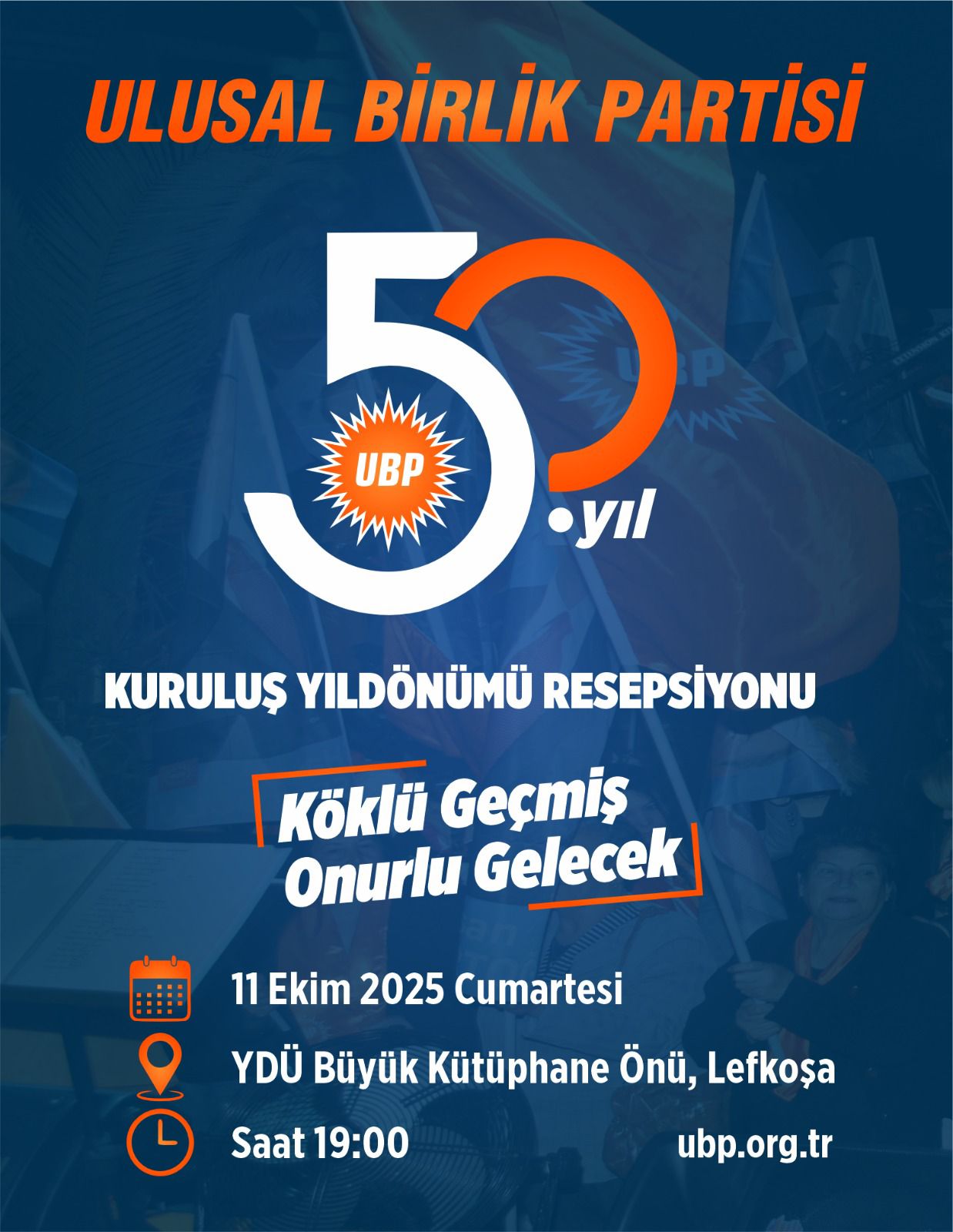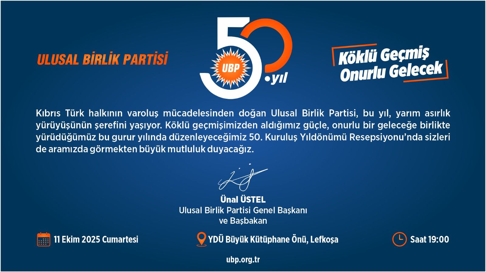 Kıbrıs Türk halkının varoluş mücadelesinden doğan Ulusal Birlik Partisi, bu yıl, yarım asırlık yürüyüşünün gururunu yaşıyor. Köklü geçmişimizden aldığımız güçle, onurlu bir geleceğe birlikte yürüdüğümüz bu gurur yılında düzenleyeceğimiz 50. Kuruluş Yıldönümü Resepsiyonu’nda sizleri de aramızda görmekten büyük mutluluk duyacağız.
