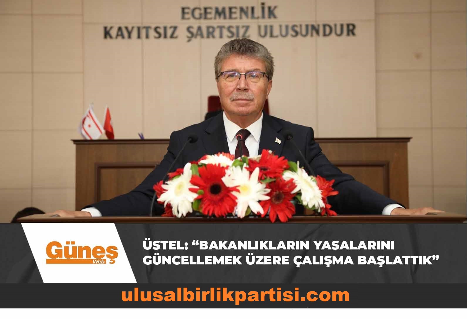 Başbakan Ünal Üstel, Cumhuriyet Meclisi’nde yaptığı konuşmada, bakanlıkların yasalarını güncellemek üzere çalışmalar yaptıklarını, bu yasaların ülkenin geleceğini şekillendireceğini söyledi.