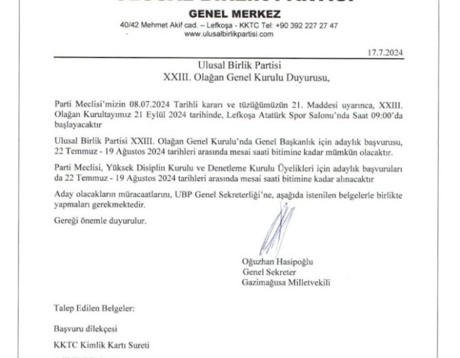 UBP Genel Sekreteri Oğuzhan Hasipoğlu, “23. Olağan Kurultay sürecimizi, ilanımızla başlatmış bulunuyoruz” dedi ve birlik içerisinde...