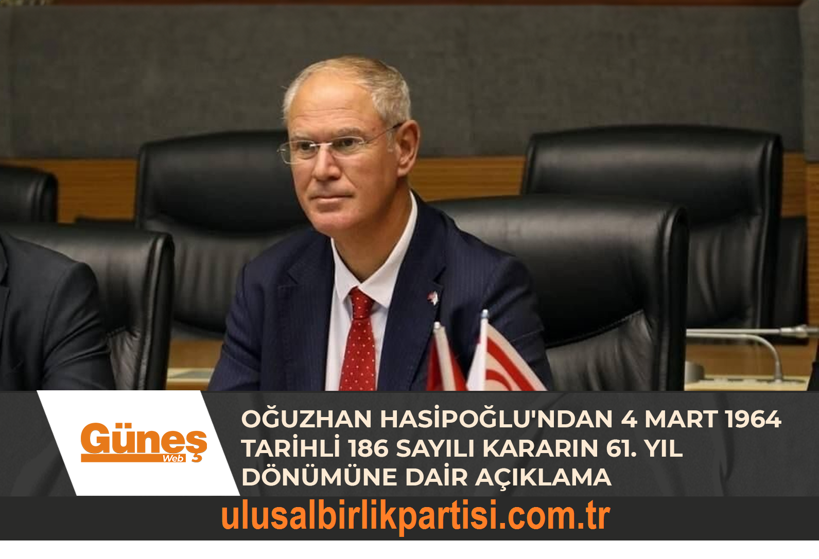 Ulusal Birlik Partisi (UBP) Genel Sekreteri Oğuzhan Hasipoğlu, 4 Mart 1964 tarihli 186 Sayılı kararın 61. inci yıl dönümü dolayısıyla yazılı açıklama yaptı.